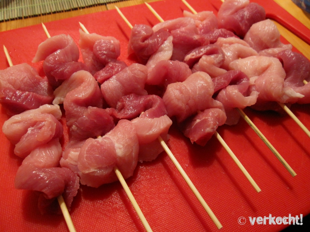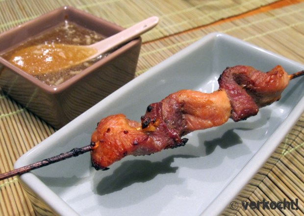 Das Schweinefleisch in dünne Scheiben schneiden und auf die Holzspieße aufspießen. Dann die Nuoc Cham mit dem Pflanzenöl vermischen und das aufgespießte Fleisch ca. 20 min damit marinieren. Wenn man möchte, kann man noch mehr Nuoc mam in die Marinade geben, dann wird der Geschmack intensiver (aber auch der Geruch!)