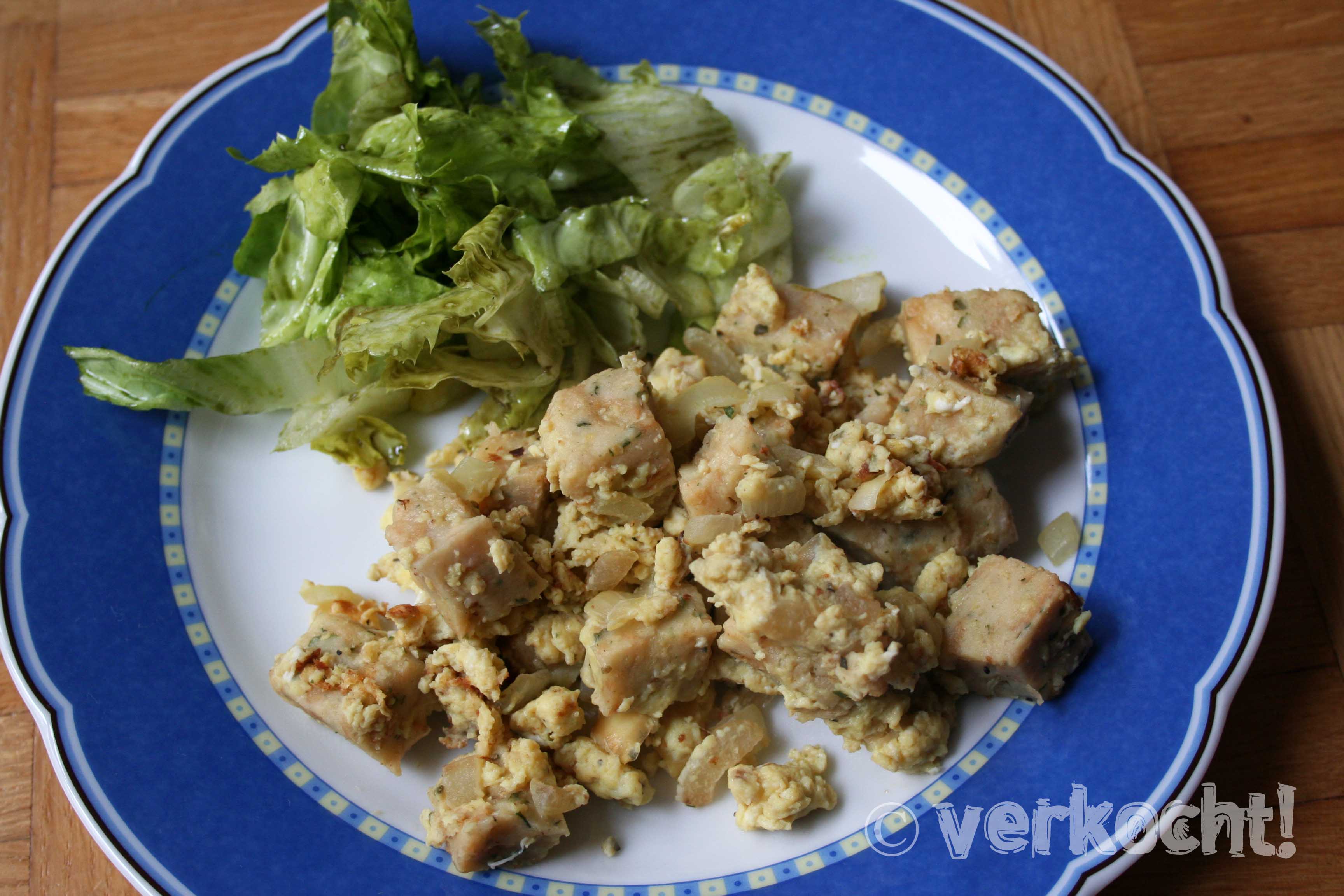 Die Eier aufschlagen und mit den geschnittenen Kräutern und den Gewürzen verquirlen. Dann den Zwiebel mit etwas Öl in einer Pfanne anrösten lassen. Wenn der Zwiebel glasig geworden ist, die geschnittenen Knödel dazugeben. Nach einer Weile dann die Eier beigeben und immer schön umrühren, bis sie gestockt sind.