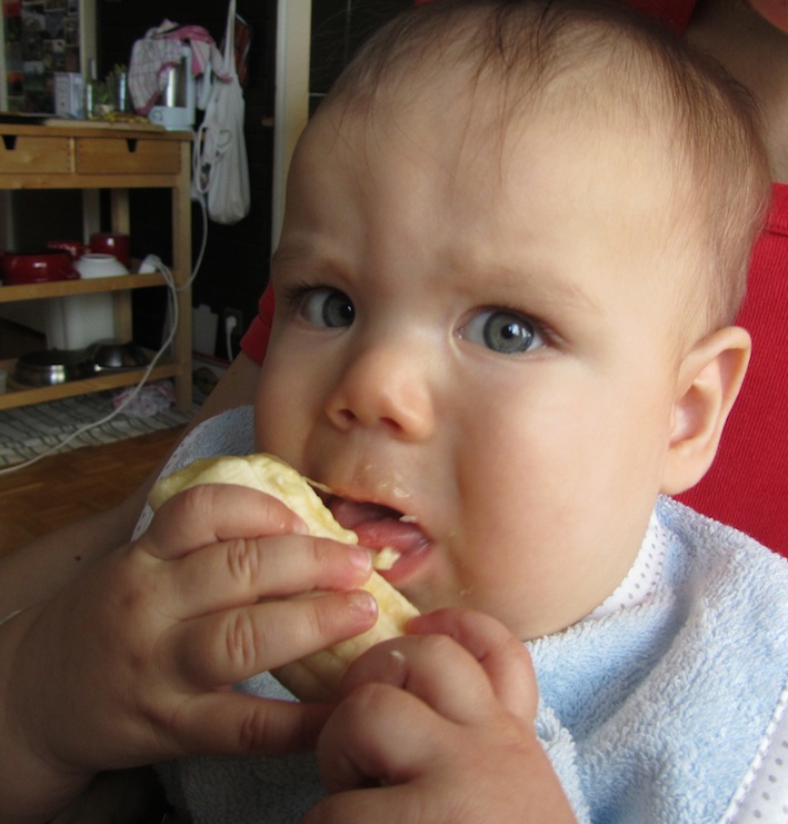 Wir haben Anfang Dezember angefangen, unserem Sohnemann manchmal etwas in die Hand zu drücken und ich muss sagen, dass ich überrascht bin, wie viel er von dem was ich ihm gebe, isst! Er hatte bisher auch keinerlei Probleme mit dem Kauen oder Schlucken. Gut, manchmal würgt es ihn ein bisserl, aber das passiert auch bei Brei. Seit dem Jahresanfang bekommt er jeden Tag zu Mittag etwas, wenn ich esse und ich bin sehr zufrieden mit seiner Experimentierfreude. Er hat bis jetzt noch alles probiert und auch geschluckt! Natürlich ist es teilweise ein UNGLAUBLICHES CHAOS, aber ich hab‘ sooo viel Spaß dabei, ihm Sachen zum Probieren zu geben, dass mir das total egal ist!