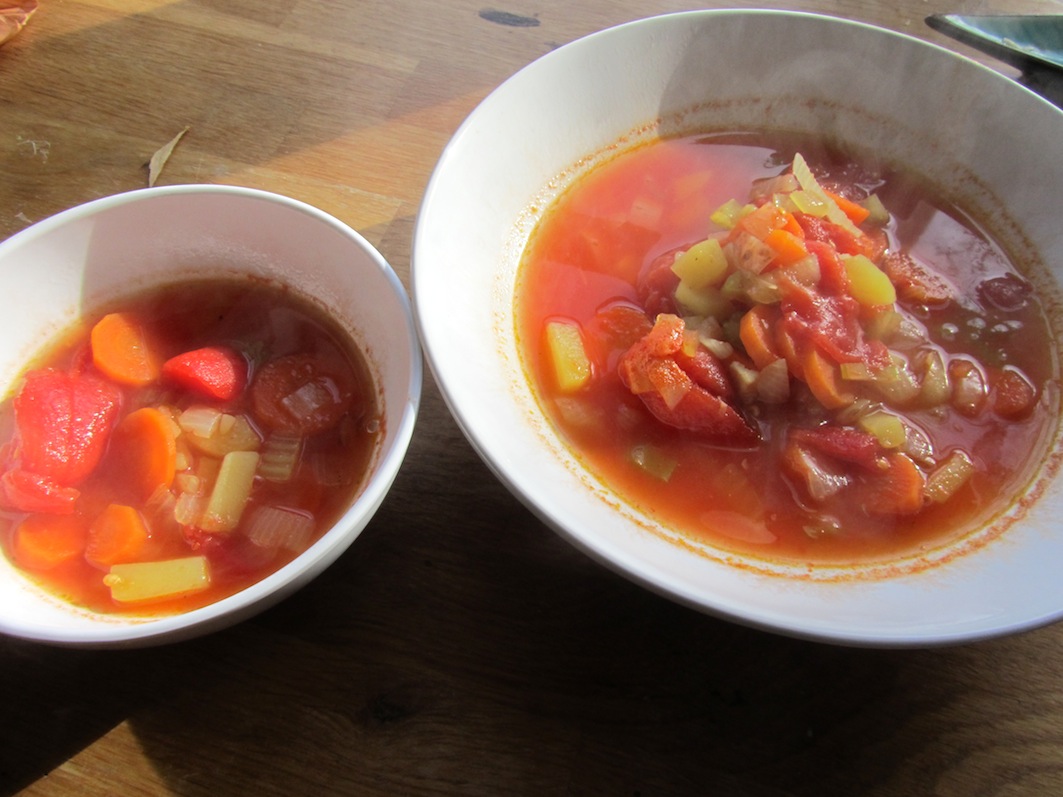 Der kleine Herr und ich haben uns dann an unsere Vormittagsbeschäftigung gemacht: Die Küche musste aufgeräumt werden und in seiner Schachtel musste offensichtlich mit dem Schneebesen umgerührt werden. Außerdem machte ich mich daran, eine gute Gemüsesuppe (diesmal war’s eine Minestrone) und Apfel-Birnenmus für den kranken Schnuffi zum Mittagessen zu kochen.