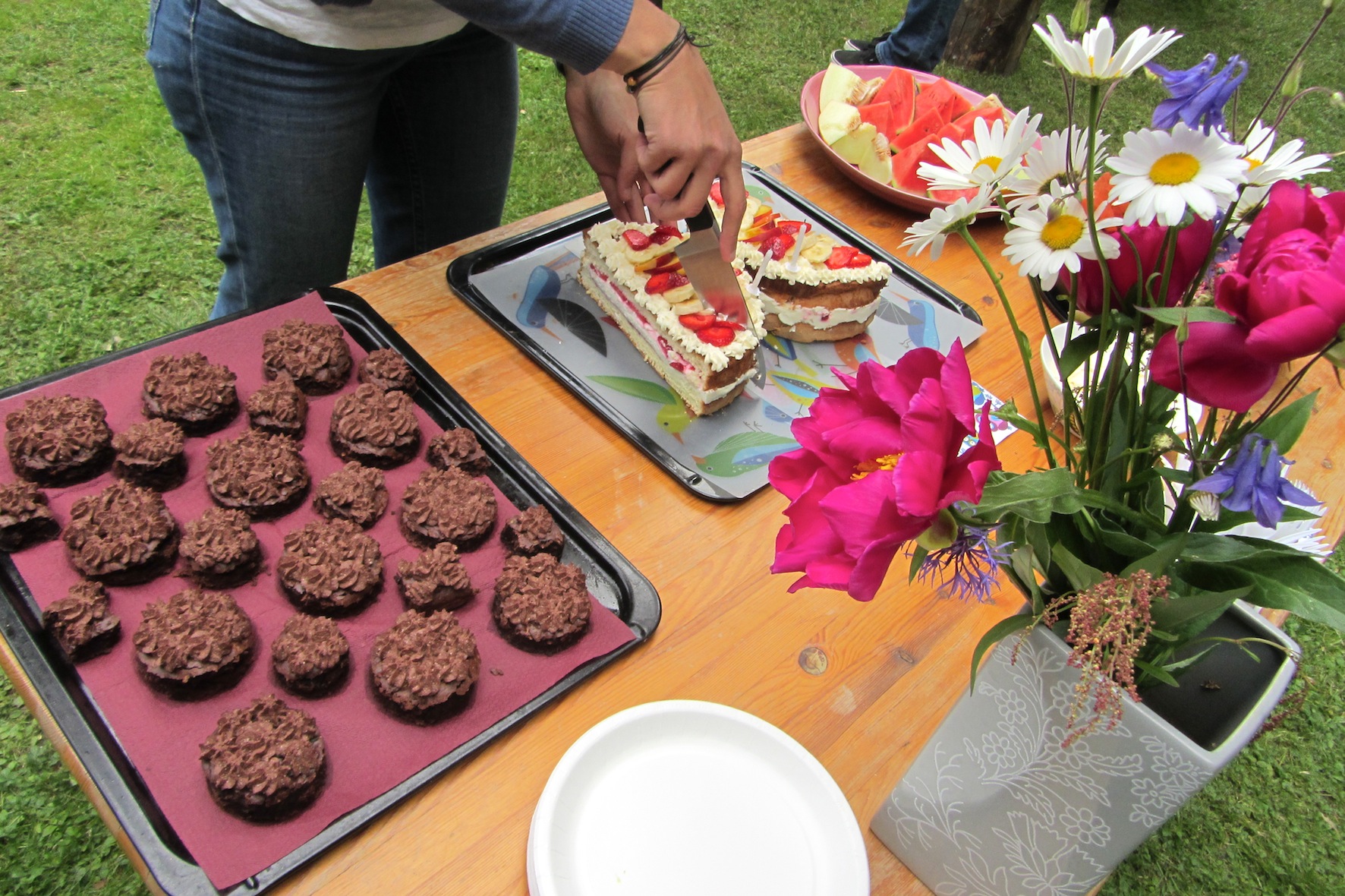 Die Schmetterlingstorte, die in Zusammenarbeit mit meiner Schwiegermutter entstanden ist, war auf jeden Fall der volle Erfolg! (Biskuitboden mit Erdbeertopfencreme, mit Schlagobers und Früchten belegt) Und auch meine veganen Zucchini-Schokoküchlein (ich hab‘ statt Sojamilch Kokosmilch genommen und einfach etwas Wasser dazugetan) mit Tofu-Sch0kocreme (Creme von diesem Rezept) sind gut angekommen.