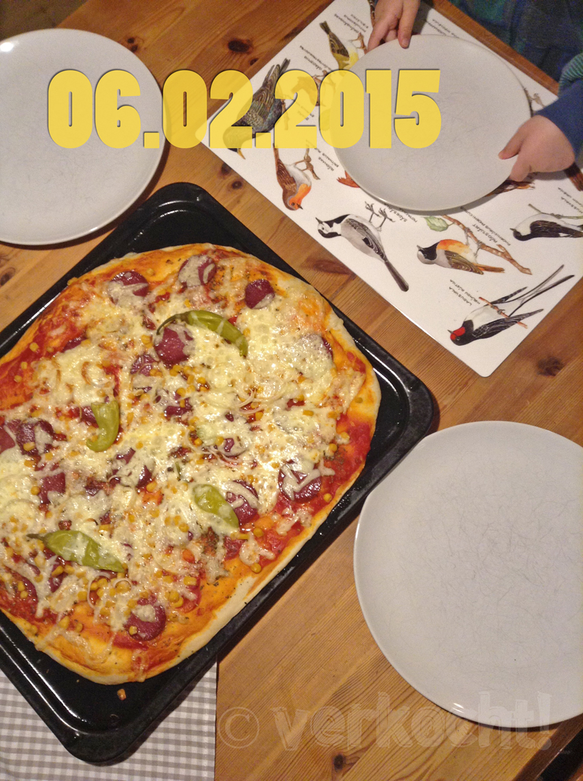 Der Ehemann ist lieberweise früher nach Hause gekommen und hat sich Pizza gewünscht. Da ich an dem Nachmittag auch backen konnte, weil er mit dem kleinen Herrn rausgegangen ist, gab’s seinen Wunsch dann natürlich auch – Salamipizza. Yummie!