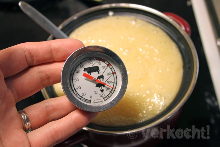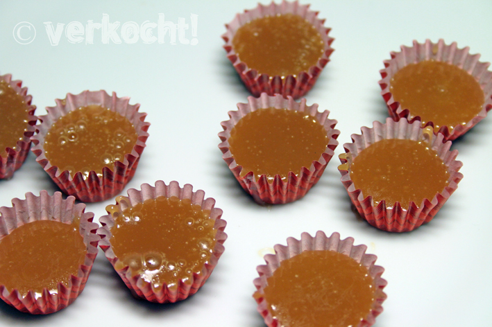 Falls ihr kein Thermometer habt, könnt ihr die Kugelprobe machen. Wenn ihr glaubt, dass das Karamell schon so weit ist (Nach 30 Minuten ungefähr könnt ihr mal probieren, aber vermutlich braucht es nochmal 20 Minuten 😉 ) gießt ihr einen Esslöffel der Masse in ein kleines Schüsserl mit kaltem Wasser. Wenn die Masse Kügelchen im Wasser bildet, ist es fertig. Wenn sie sich auflöst, nicht.