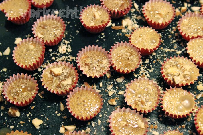 Es musste auf jeden Fall ein schnelles Rezept her. Und dieses schnelle Rezept ist eben „Knäck“. Knäck ist einfaches Karamell, (hier oben Kola genannt) das in kleine Förmchen gefüllt wird. Aus. Mehr is es nicht. Man kann allerhand ins Karamell geben. Nüsse, Schokolade, Gewürze. Alles ist erlaubt. Aber klassisch ist das Knäck ganz ohne alles. Ich habe zur Hälfte der Knäck gehackte Mandeln gegeben.