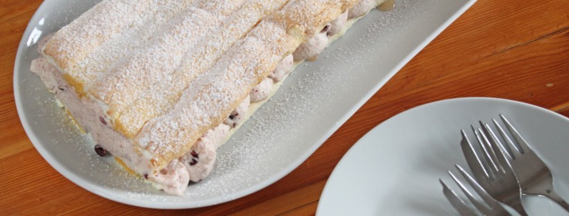 Die Böden vorsichtig vom Backpapier lösen und den Unterboden auf euer Servierteller oder Tortenteller geben. Die Creme draufdressieren oder verstreichen. Dann den Oberboden vorsichtig drauflegen. Jetzt solltet ihr die Schnitte ein paar Stunden kühl stellen, damit die Gelatine fest werden kann. (Oder ihr esst sie gleich sofort, so wie wir und riskiert, dass das Schneiden nicht ganz so reibungslos abläuft.)