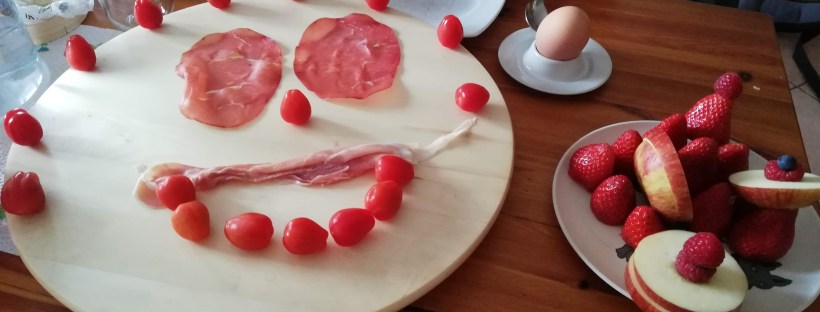 Den Kindern habe ich wieder Overnight-Oats gemacht, ich trinke meinen Schwarztee mit Milch. Aufs selber Frühstücken vergesse ich irgendwie!? Ich muss aber sowieso schnell zum Diskonter wegen Sandalen für die Kids, dort kaufe ich mir schnell ein paar Weckerl (rot wegen Invertzuckersirup) und Prosciutto. Da esse ich dann 2 vor der Arbeit.