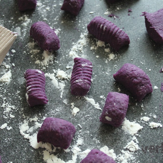 Für die Gnocchi die Lila Süßkartoffeln in der Schale im Ofen für 45 min bei 200 Grad backen. Dann herausnehmen, Schale einschlitzen und einfach vo gekochten Fleisch abziehen. Noch heiß durch die Kartoffelpresse drücken. Abkühlen lassen.