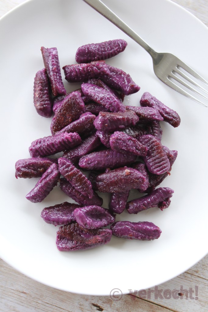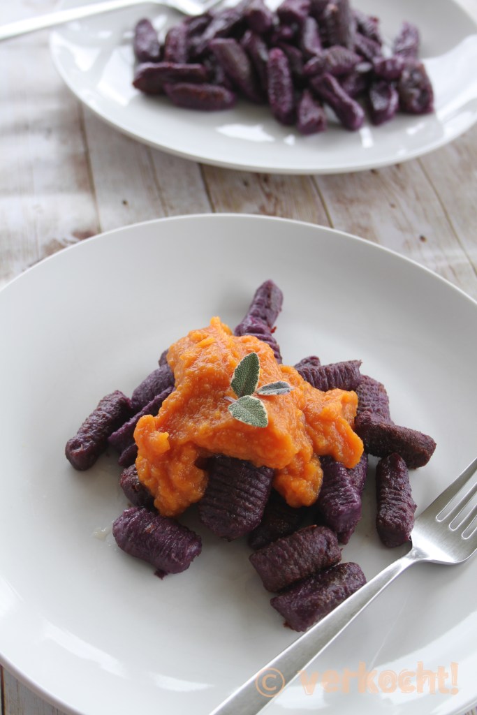 Lila Süßkartoffelgnocchi mit Kürbistomatensauce