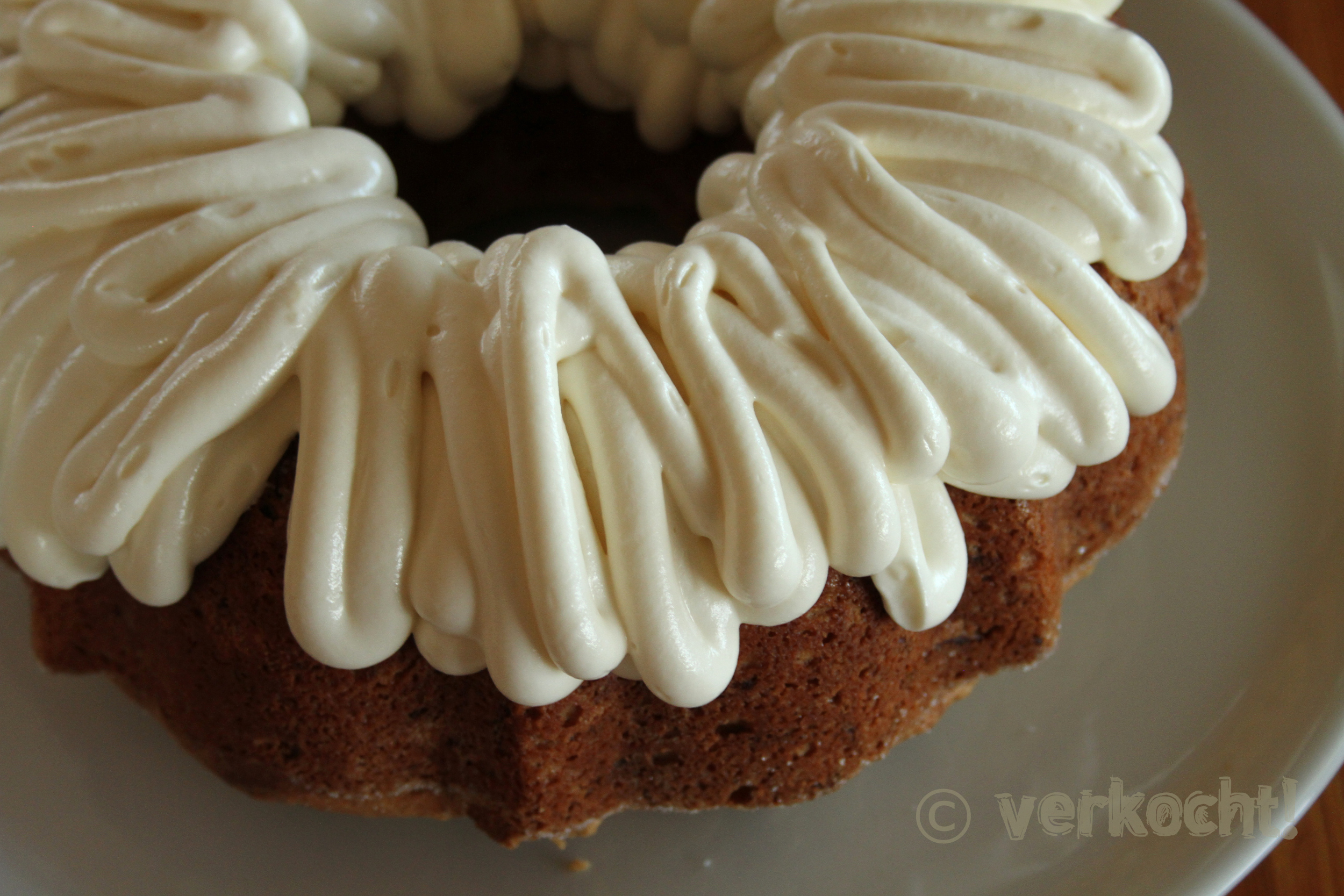 Die Kürbisflut hat einfach nicht aufgehört und deshalb habe ich nochmal was damit gebacken. Diesmal war es ein Kürbisgugelhupf mit Frischkäseglasur.