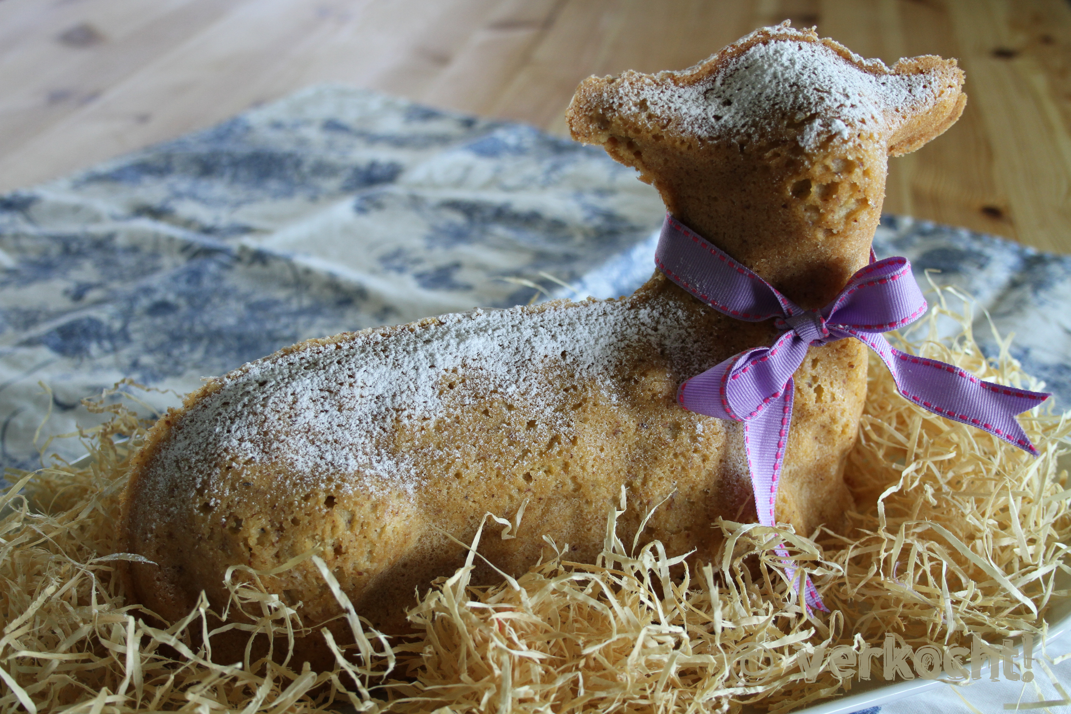 Falls nötig, den Boden des Kuchens gerade schneiden, auf einem Teller anrichten und traditionell wird das Lamm noch mit Staubzucker bestreut. Sooo saftig und köstlich!