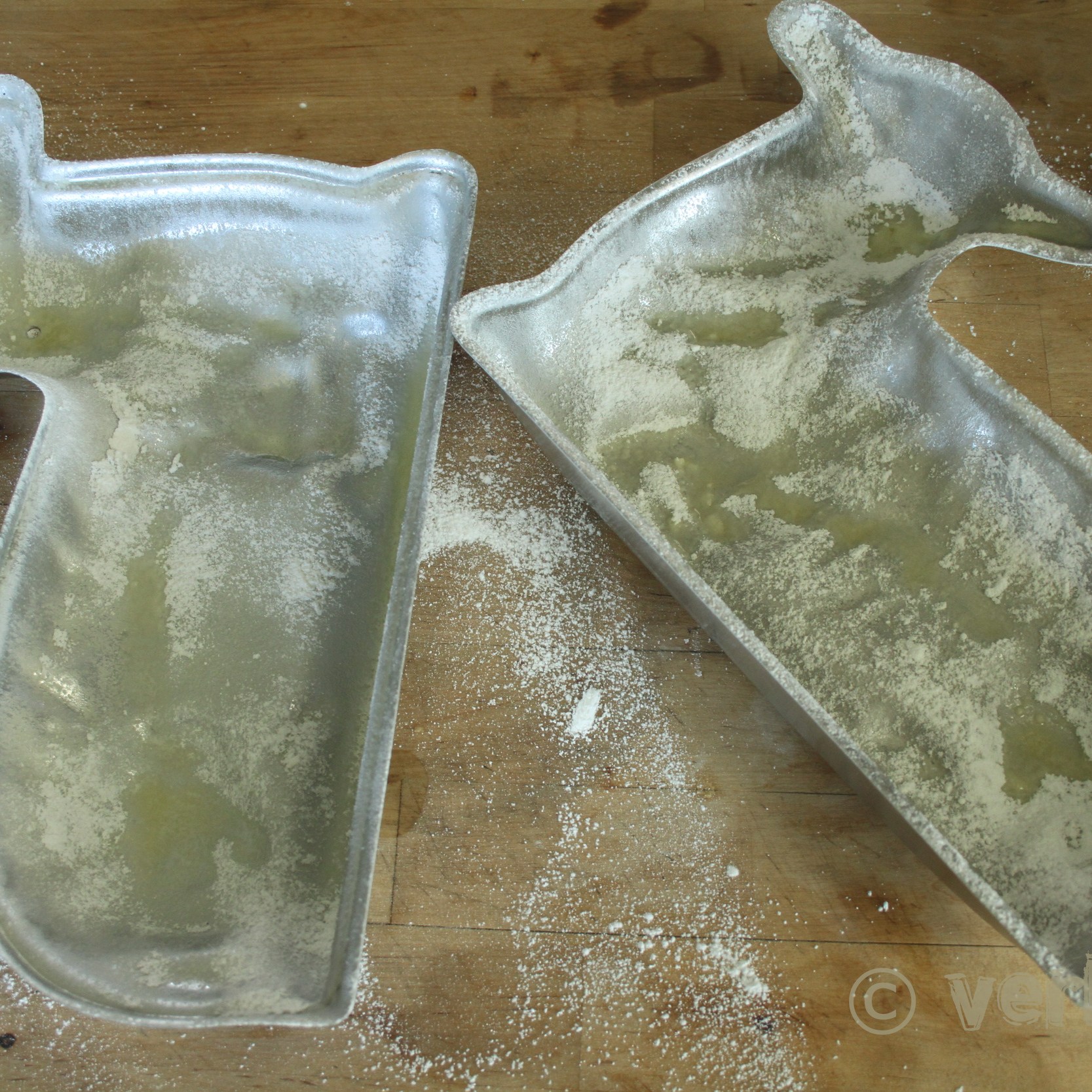 Das Rohr auf 190 Grad Ober- Unterhitze (170 Grad Umluft, 375 Grad Fahrenheit) vorheizen. Die Form wirklich sehr gut ausfetten (vor allem die heiklen Stellen wie die Ohren und die Schnauze) und mit Staubzucker ausstreuen.