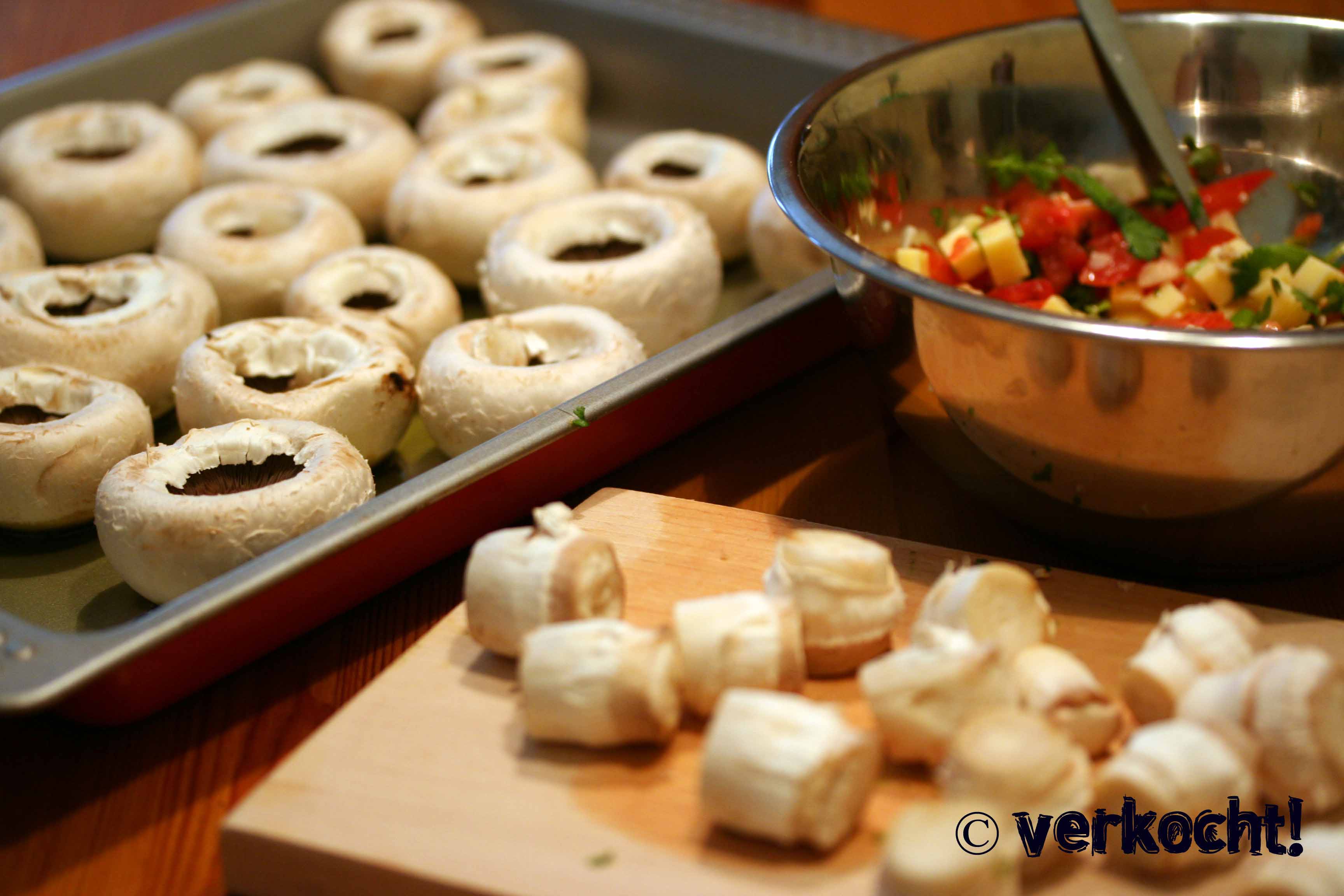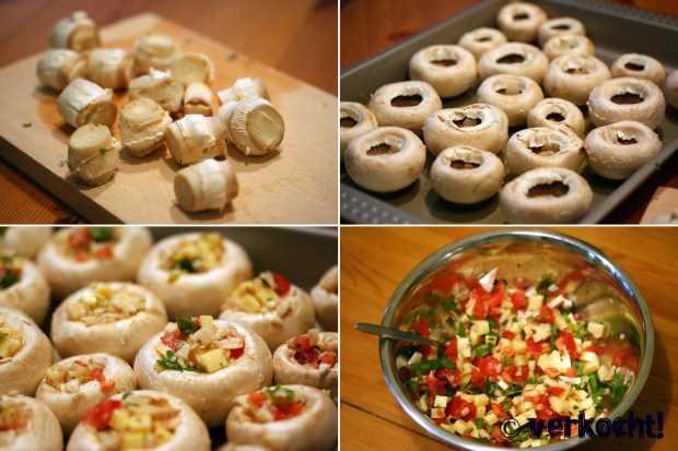 Die Stiele der Champignons entfernen (einfach mit den Fingern herausbrechen) und in ganz kleine Stücke hacken (mit Zik- Zyllis geht das superschnell!) Vorsicht: Die Schirme der Pilze müssen ganz bleiben!! Den Rest der Zutaten auch kleinhacken und mit den kleingehackten Champignonstielen vermischen. Dann optional noch kleingeschnittenen Speck und Mayonnaise dazu und mit den Kräutern, Salz und Pfeffer würzen. Die Champignons füllen (es passt in jeden Champignon ca. 1 Teelöffel Fülle) und mit Olivenöl beträufeln. Dann entweder auf dem Griller grillen oder in einem mit Olivenöl befettetem Blech im Rohr bei 100°C für ca. 20 min backen. Schmeckt toll!