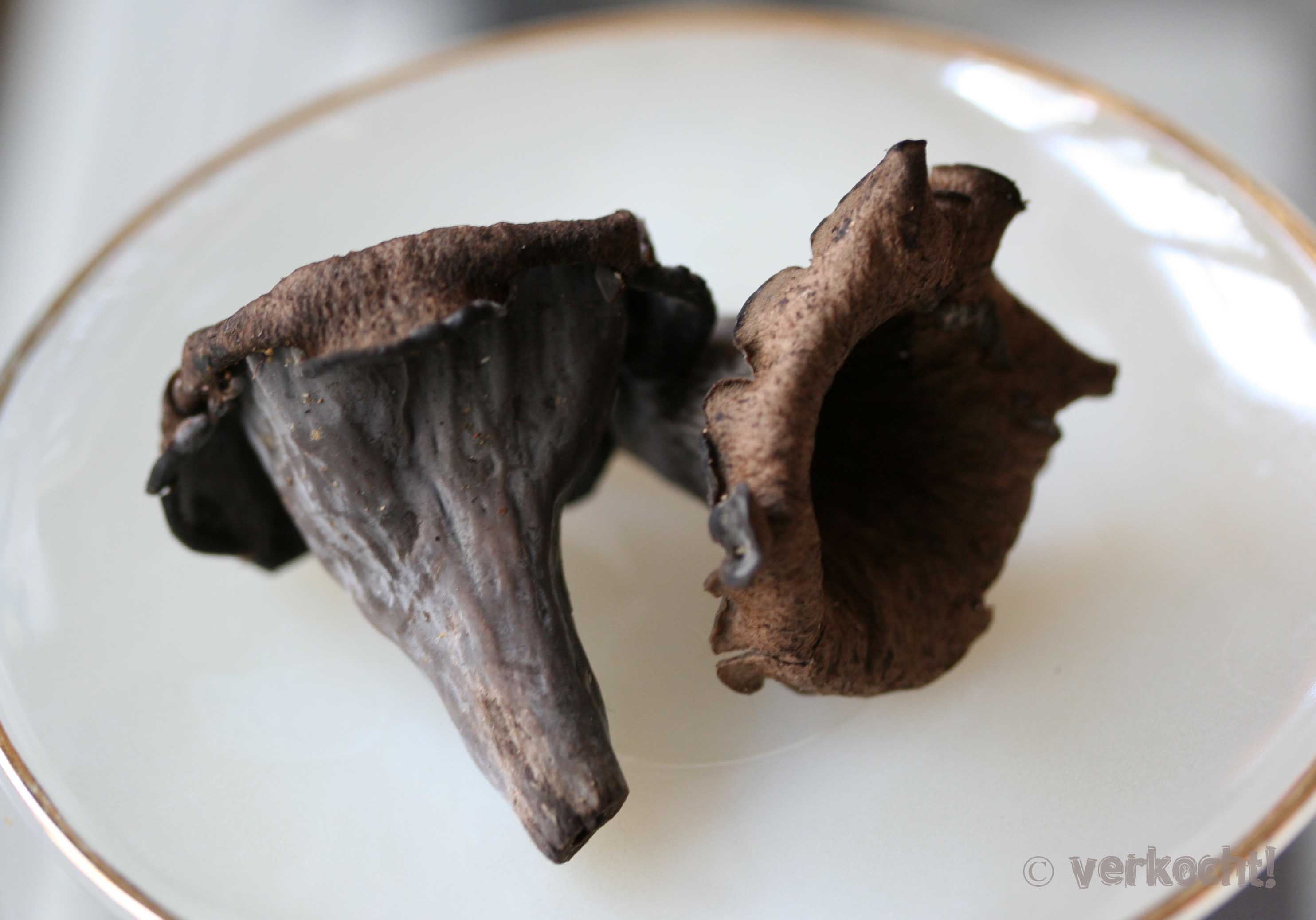 Für die Sauce den Zwiebel und Knoblauch schälen, klein schneiden und anbraten. Die Herbsttrompeten putzen, grob hacken und auch mit anbraten. Die Pilze werden beim Anbraten ziemlich viel Wasser verlieren. Dieses Wasser etwas verkochen lassen, dann mit einem Esslöffel Melch stauben, umrühren und danach mit der Sahne aufgießen. Umrühren und köcheln lassen, bis die Sauce durch das Mehl andickt. Danach würzen und mit Petersilie verfeinern. Fertig!