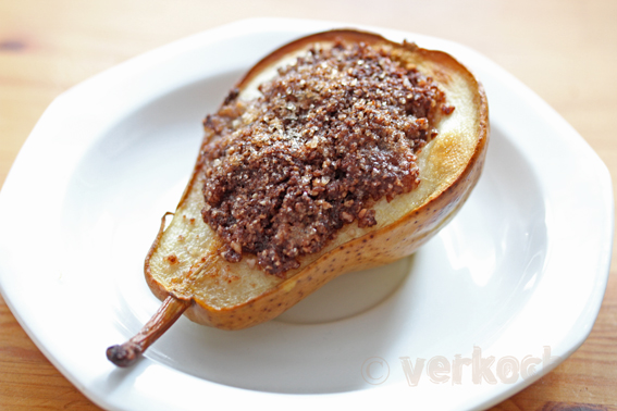 Zubereitung: Die vom Kerngehäuse befreiten Birnen werden mit Birnenstücken und den restlichen Zutaten gefüllt und im Backofen in einer Auflaufform mit dem Weißwein gegart. Man serviert sie heiß.