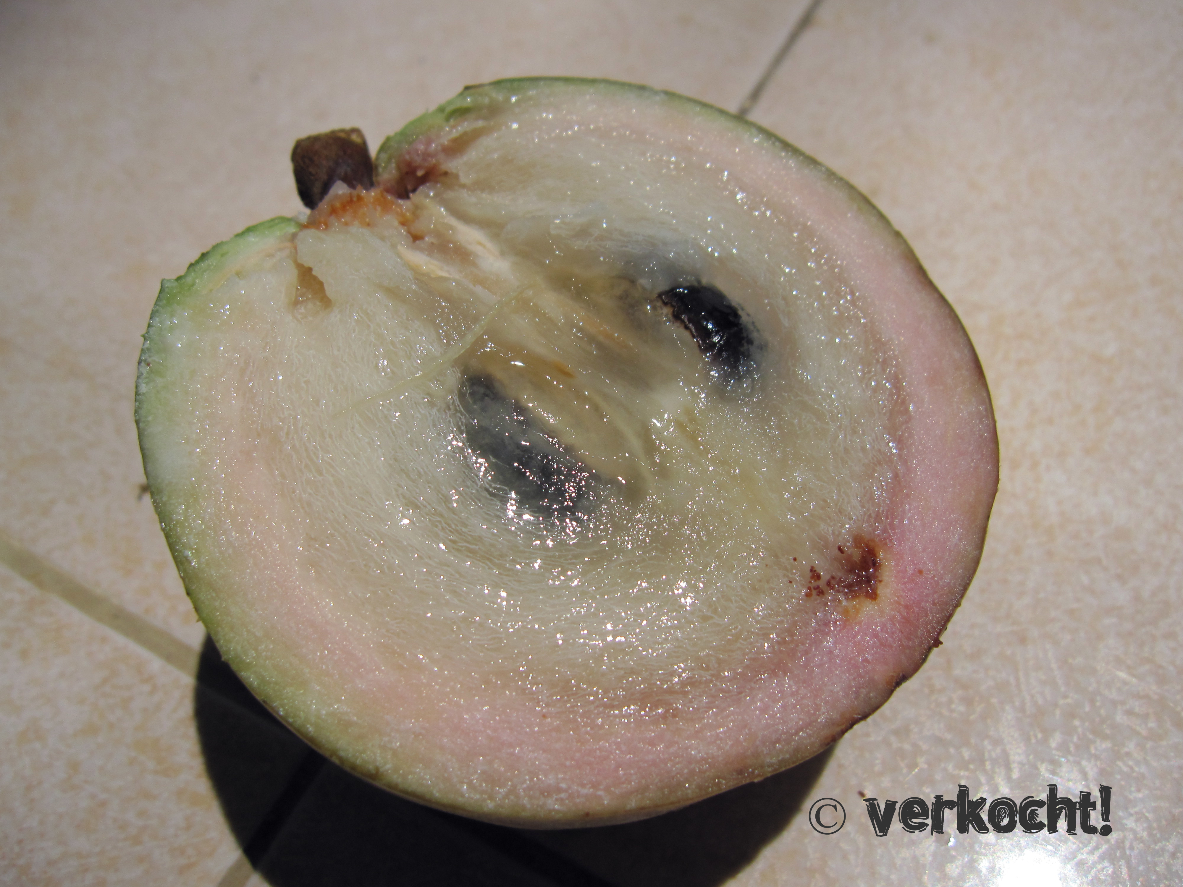 Die Schale der Frucht kann von grün bis dunkelrot/braun wirklich alles sein. Das Fruchtfleisch sieht genau aus wie das einer Litschi und der süße Geschmack erinnert auch sehr an eine Litschi.