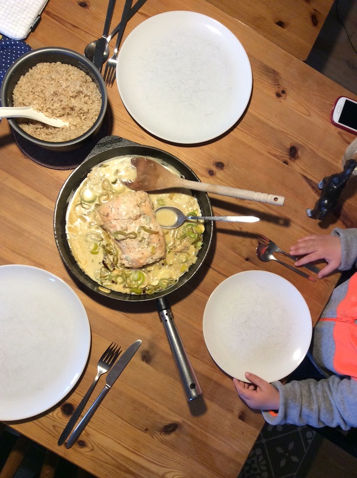 Die SONNE! hat sich hinter den Wolken hervorgetraut und wir hatten frühlingshafte 13°C und konnten auf der Terrasse essen! Juhuuh! Als Sonntagsessen gab‘ es wunderbare Hühnerschnitzel mit Erbsenreis und grünem Salat mi Kernöl-Balsamicodressing. Yummie!
