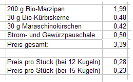 Zur Berechnung ziehe ich, wenn es möglich ist, immer die Bio-Preise heran. In diesem Fall war es mir jedoch nicht möglich, Bio-Maraschinokirschen zu bekommen.